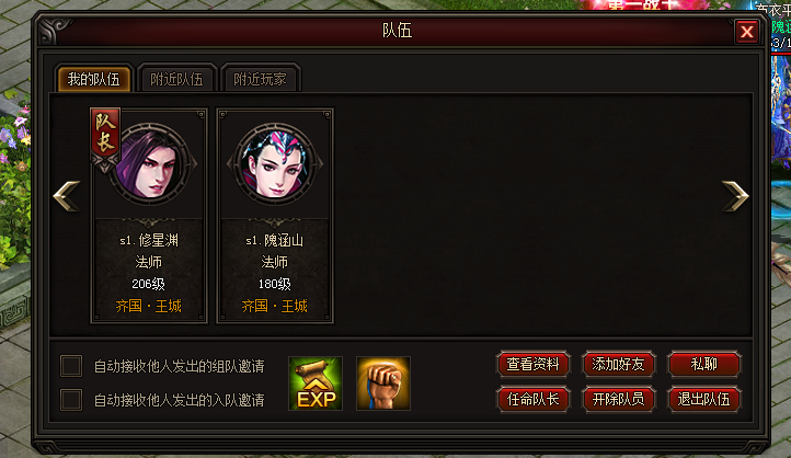 点击游戏右侧的队按钮,就可以打开队伍面板,可以设置组队的相关功能,查看队友资料、开除队员、离开队伍等,还可以查看经验以及属性的加成。