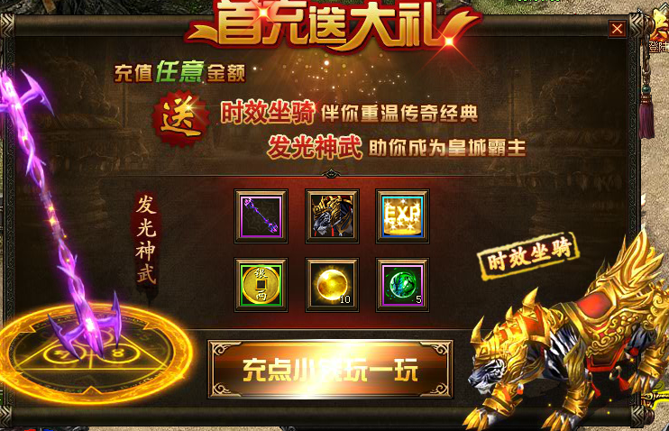 贪玩决战九天首冲礼包。每个角色仅限一次,充值任意金额之后游戏里面都可以免费领取一份首冲礼包!