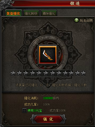 每件装备都可以进行强化,70级以上的装备最高可以强化到12星。在界面点击“锻造”-“强化装备”就可以进行强化了。70级以上的装备没有强化前都有12次强化的机会,强化失败将减少强化次数。强化失败不掉等级,但是会减少强化次数,可以用元宝保证强化几率100%成功,或者强化次数使用完后,用元宝购买强化次数,继续强化。强化至满星的装备可获得最强大的属性,渡劫过后可以佩戴特殊的天劫装备。