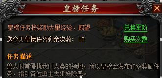 在皇榜任务处可以接受皇榜任务从而得到大量的经验和威望值,威望值可以兑换军阶,军阶越高增加的属性越多。