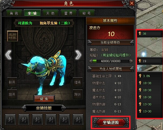 升级坐骑,可以获得生命,攻击,防御属性。升级坐骑需要坐骑进阶丹。坐骑进阶丹会从怪物身上掉落。