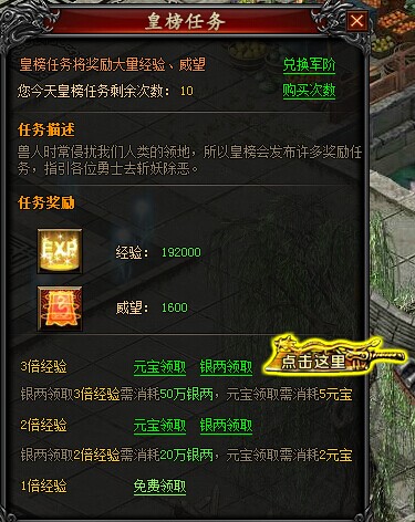 ※等级达到54级左右之后,有个任务强烈推荐的,那就是皇榜任务,非常非常多的经验和威望值,而且任务非常简单。皇榜任务每天可以做10次,可以在比绮城皇榜任务处领取任务,完成之后可以使用元宝或者银两领取3倍经验,即使不使用元宝领取,经验也是非常非常丰厚的,所以建议各位每天记得完成。