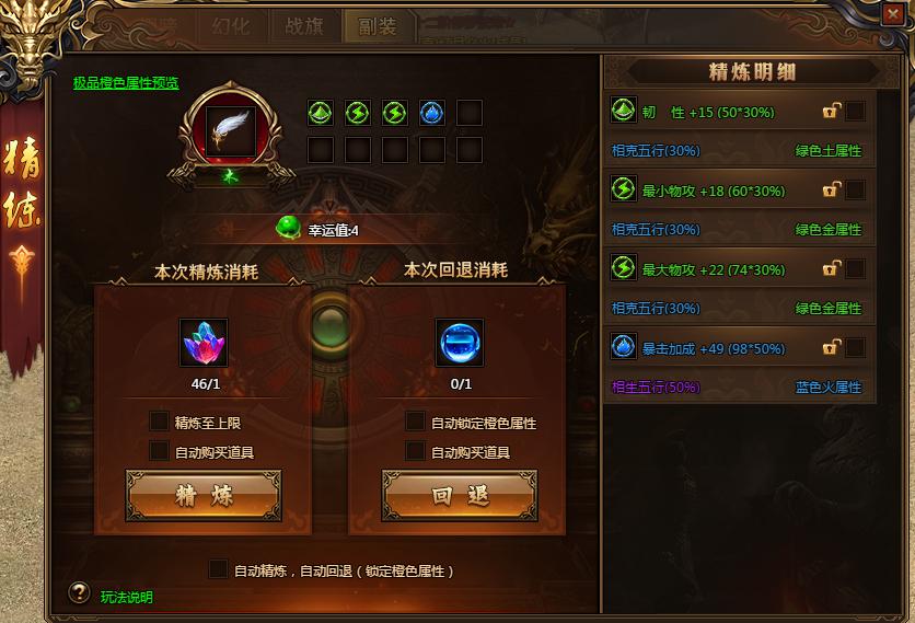 4)精炼属性可回退重新洗练,满意的属性可锁定不回退,回退需消耗归一真水材料