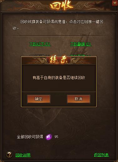 2、可回收高于已穿戴的战旗装备,回收有提示防止误操作