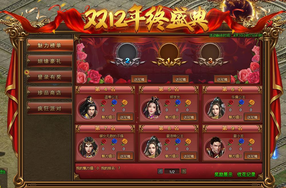 活动规则:活动期间,玩家可赠送玫瑰花给自己或者他人增加魅力值,获取魅力排行