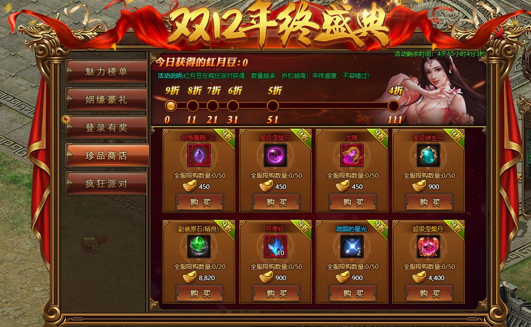 活动规则:活动期间,使用红月豆可获得的商品折扣,全年只一次,错过等明年!
