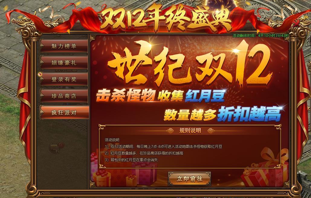 活动规则:活动期间,击杀怪物收集红月豆,赢取折扣大礼。