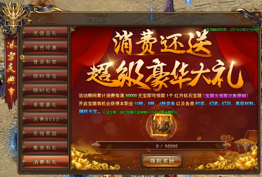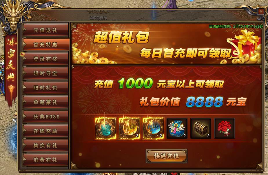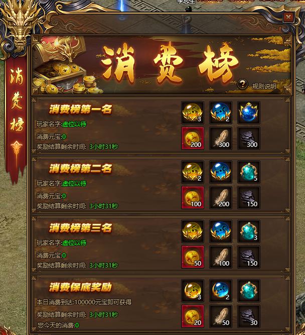 活动规则:活动期间,每充值1000元宝即可领取超值大礼包一份!
