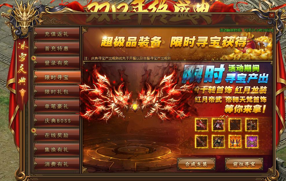 活动规则:活动期间,限时寻宝新增产黑天遮日翅膀、圣鸦轻语、暗语蔽日(女)、暗夜挽歌、如意金箍棒、山神【折戟】、猩红强袭彗星、齐天大圣、钢铁侠、紧身红衣、盾甲、黯焰翼骸、九命裘衣(女)、惊魂灵狐剑、双子守护、至高超人战甲(女)、红月龙袍-无相神皇御(女)、圣羽之辉、双鱼守护、高阶十转首饰、红月龙装、红月帝武、帝释天梵首饰,有没有心动,想不想要,快点寻宝抽起来!