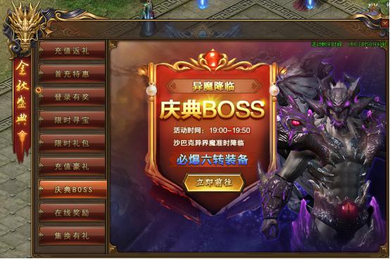 活动规则:庆典期间每天晚上19:00-19:50沙巴克异魔准时降临,必爆六转装备哦!也有概率获得八转装备哦!