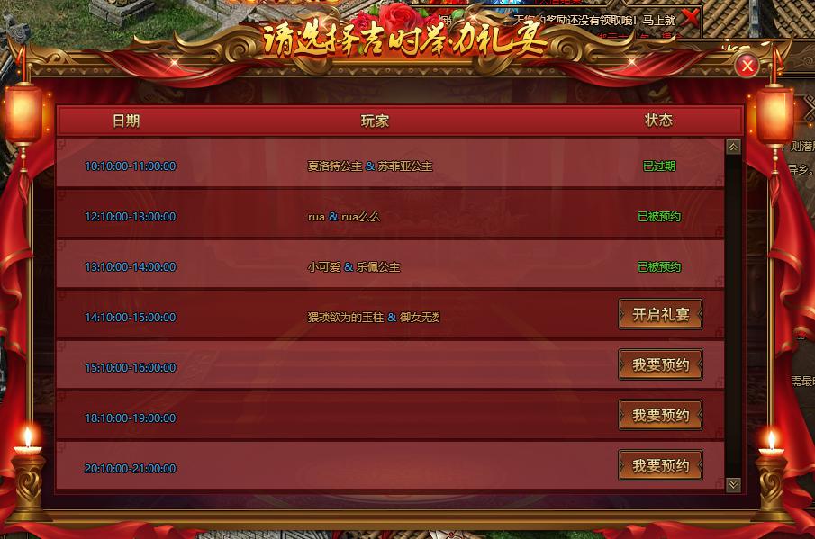 ⑥ 每天的婚礼按一小时一场分,玩家需要提前预约可预约的场次。(已经过期、被预约的无法预约)
