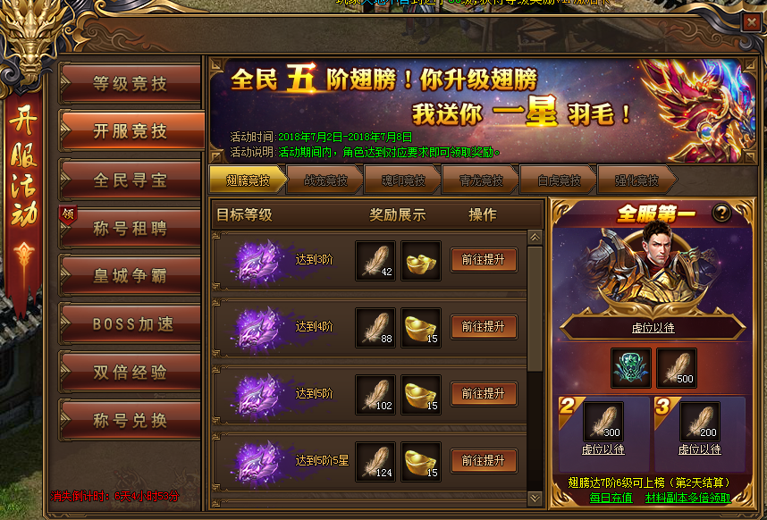 活动内容:活动期间,角色达到对应要求即可领取奖励,竞技排名第一名更可获得本职业六转装备,开服7天6转一套不是梦。翅膀竞技第2天结算排名,战宠竞技第3天结算排名,魂印竞技第4天结算排名,青龙竞技第5天结算排名,白虎竞技第6天结算排名,强化竞技第7天结算排名。