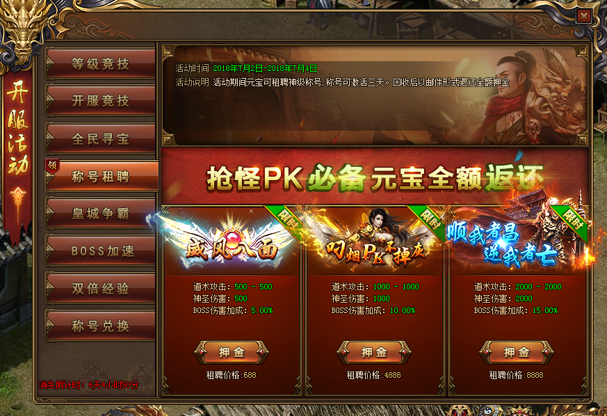 活动内容:新服前7天可租赁神级称号,称号激活3天,称号回收后元宝全额返还,神级称号,助你打怪更轻松