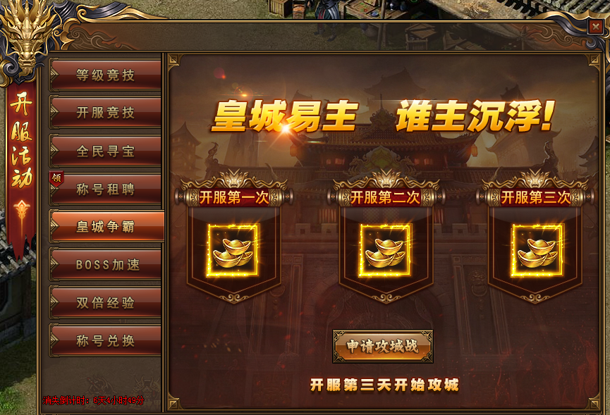 活动内容:开服第3天开启首次攻城战,第5天第二次攻城,第7天第三次攻城,每次攻城获胜,城主可领取1w元宝奖励。皇城易主,谁主沉浮,做兄弟,有今生无来世!