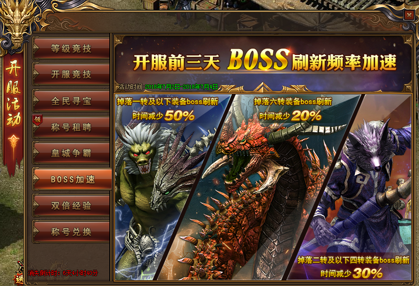 活动内容:开服前3天BOSS加速刷新,恶魔滋生,并且到处劫掠,身上携带了不菲的装备法宝,勇士请前往消灭他们。