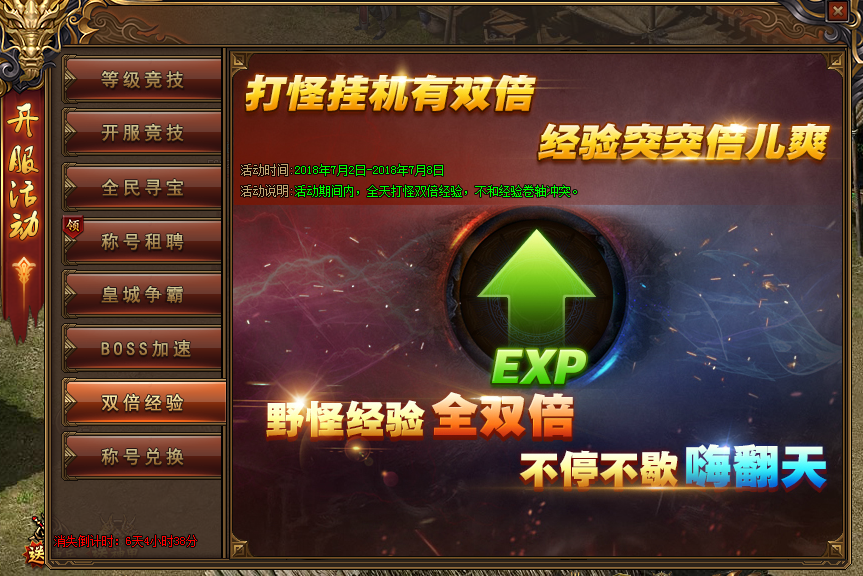 活动内容:开服前7天,全天打怪双倍经验,并且不合经验卷轴冲突,等级一飞冲天就在此刻。