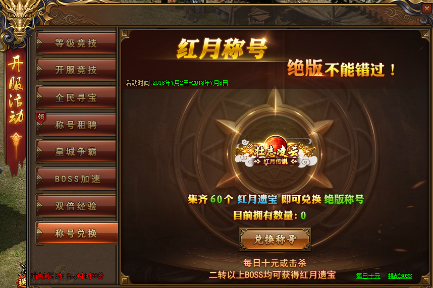 活动内容:开服前7天,击杀2转以上boss或者是每日充值10元均可获取红月遗宝,集齐60个即可兑换红月称号,绝版不能错过,壮志凌云,就在红月传说。