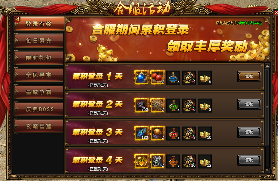 合服内容:合服期间累积登陆,领取丰厚奖励