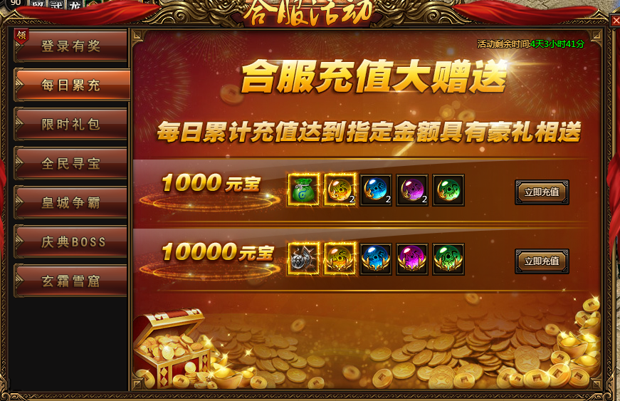 合服内容:合服充值大赠送,每日累计充值达到指定金额具有豪礼相送。