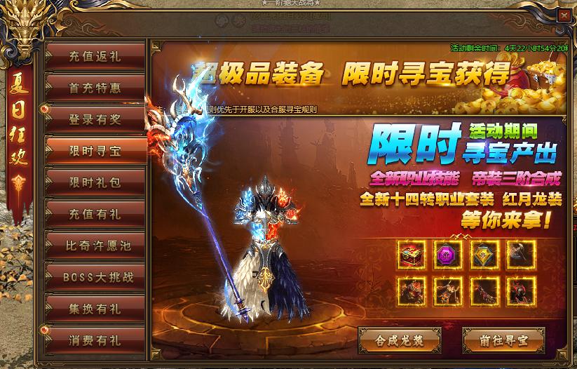 活动规则:活动期间,限时寻宝新增产天佑之星,攻速武器,帝王之星,伸缩武器,(仅限本次寻宝)诛仙套装,屠龙套装高阶十转首饰、红月龙装、红月帝武、帝释天梵首饰,有没有心动,想不想要,快点寻宝抽起来!