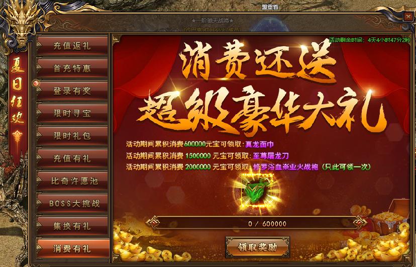 活动规则:活动期间,累计充值达到相应要求,可获得对应档次的奖励哦,档挡有惊喜!