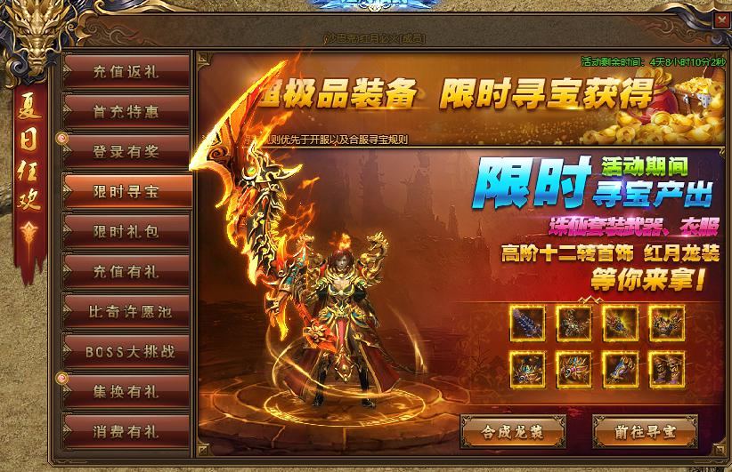 活动规则:活动期间,限时寻宝新增产诛仙武器衣服1阶、限量伸缩武器、永垂不朽套装、高阶十转首饰、红月龙装、红月帝武、帝释天梵首饰,有没有心动,想不想