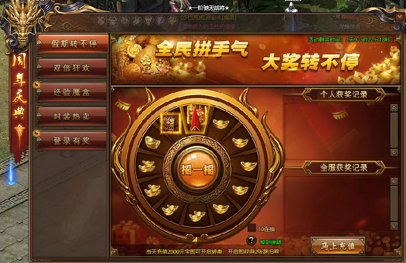 活动规则:全名拼手气,大奖转不停,玩家可通过获得的辞旧券迎新券开启转盘。