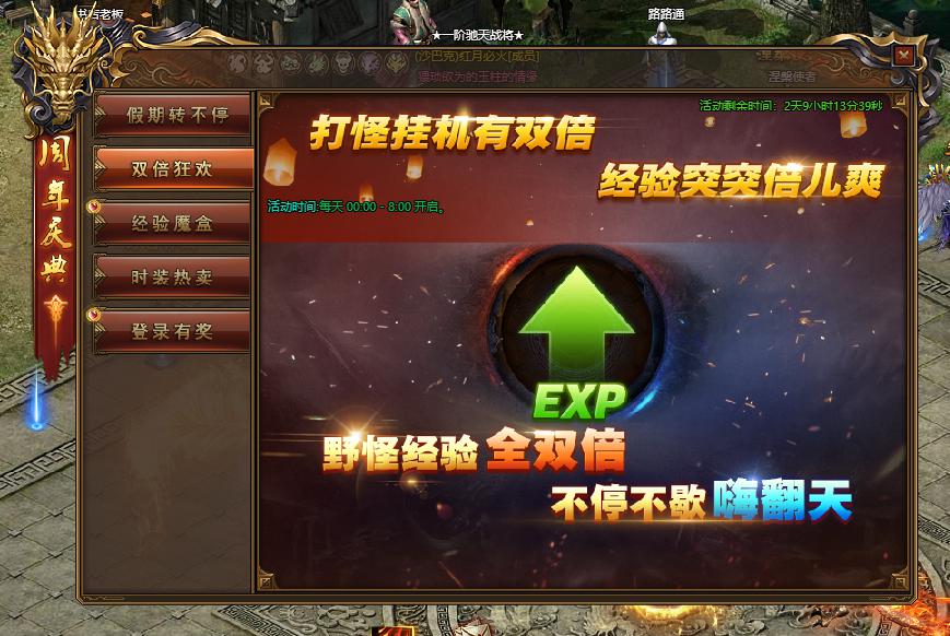 活动规则:活动期间00:00-08:00,打怪挂机可获得双倍经验。