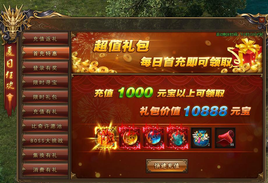 活动规则:庆典期间,在比奇许愿池投入宝物,第二日可获得双倍惊喜!
