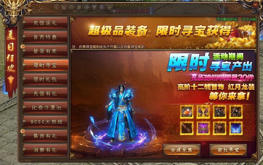 活动规则:活动期间,限时寻宝新增产炫酷孔雀艳翎甲、限量伸缩武器、永垂不朽套装、美队盾牌,黑暗骑士、魔环、烈焰屠龙、 疾风套、五行套、绝版时装、两仪碎星旗、霜火龙神皇、红月魔装(3阶)(女)、双子守护、红月龙袍-无相神皇御(女)、高阶十转首饰、红月龙装、红月帝武、帝释天梵首饰,有没有心动,想不想要,快点寻宝抽起来!