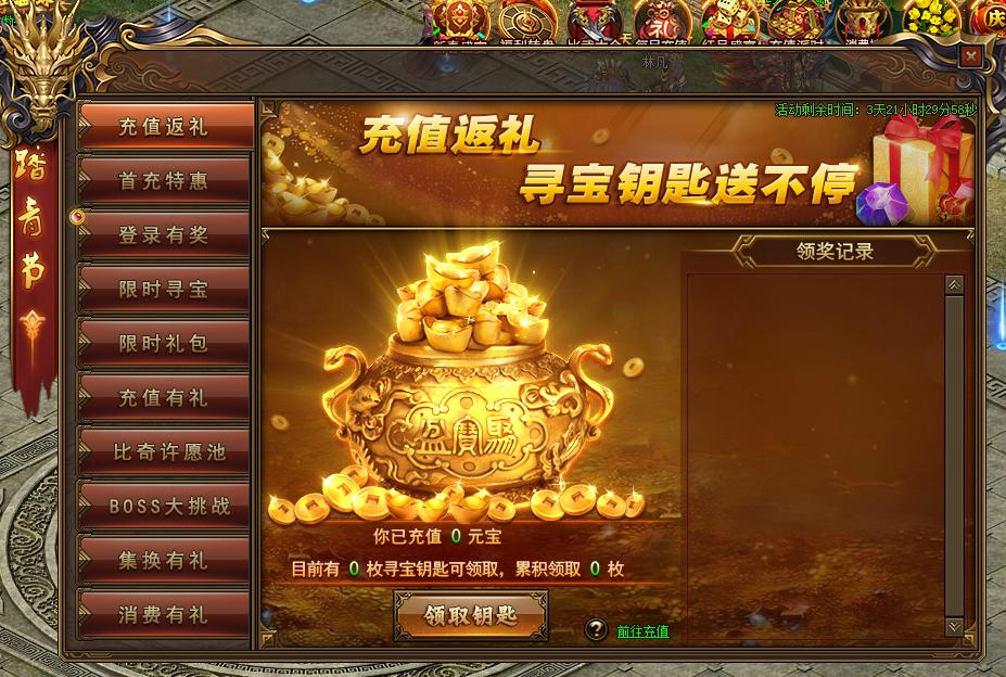 活动规则:活动期间,每累计充值2000元宝即可获得一枚寻宝钥匙,上不封顶;机会不多不要错过了哦!