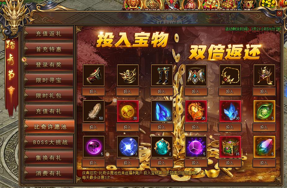 活动规则:庆典期间,在比奇许愿池投入宝物,第二日可获得双倍惊喜!