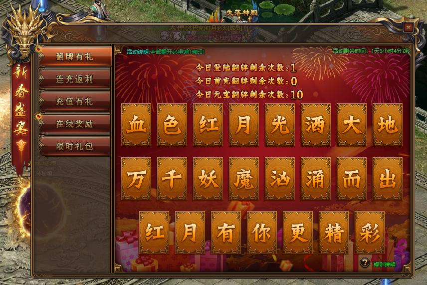 活动规则:活动期间,翻牌有惊喜,全部翻开必得本职业14阶元神武器