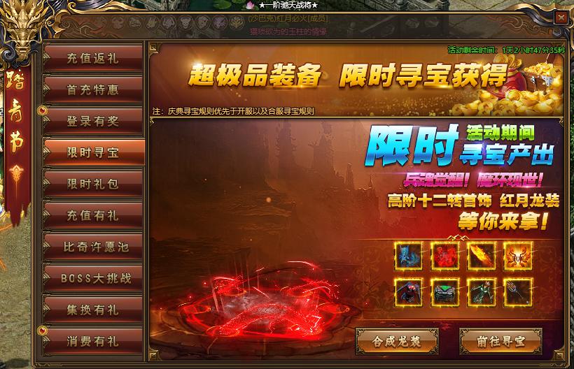 活动规则:活动期间,限时寻宝新增产 黑暗骑士、魔环、烈焰屠龙、 疾风套、五行套、孔雀开屏刀,绝版时装、两仪碎星旗、霜火龙神皇、红月魔装(3阶)(女)、双子守护、红月龙袍-无相神皇御(女)、高阶十转首饰、红月龙装、红月帝武、帝释天梵首饰,有没有心动,想不想要,快点寻宝抽起来!