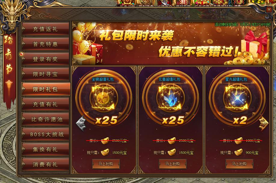活动规则:活动期间,每充值1000元宝即可领取超值大礼包一份!