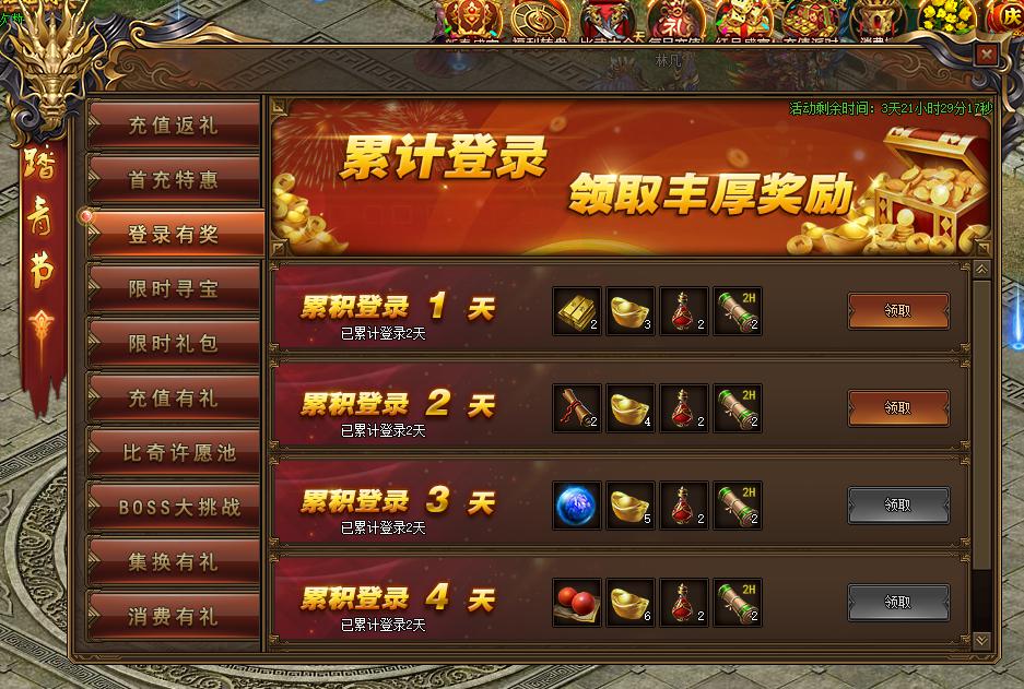 活动规则:活动期间,累计登录领取丰厚奖励,每天都有新惊喜!