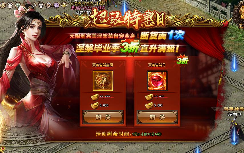 活动规则:活动期间,完美涅槃装备3折购买,超值优惠赶快行动起来吧。