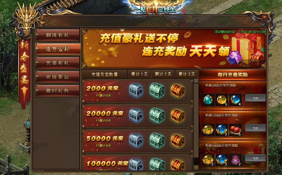 活动规则:活动期间,每日充值元宝数量达指定金额可领取对应奖励。
