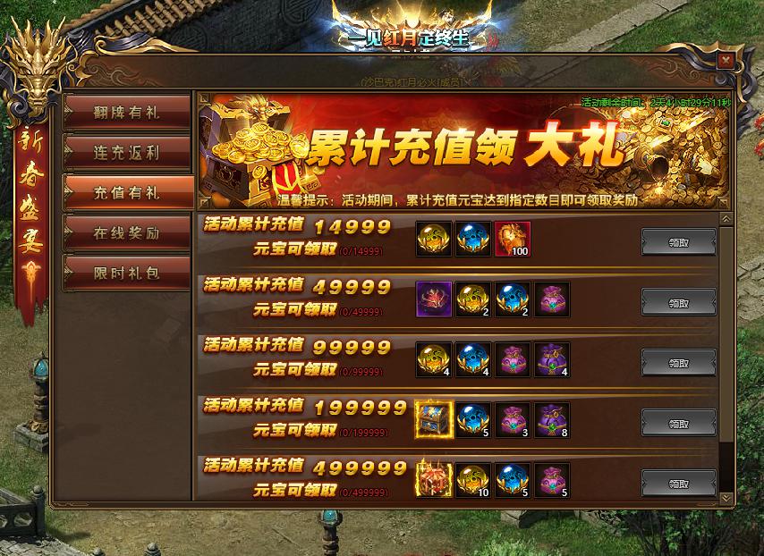 活动规则:活动期间,累计充值元宝达指定数量即可领取奖励。