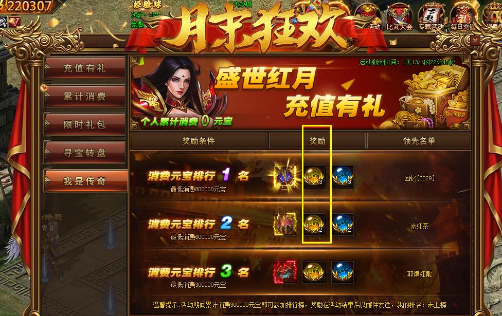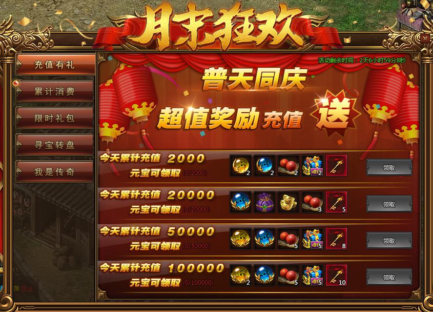 活动规则:活动期间,充值达到相应要求,可领取超值奖励!