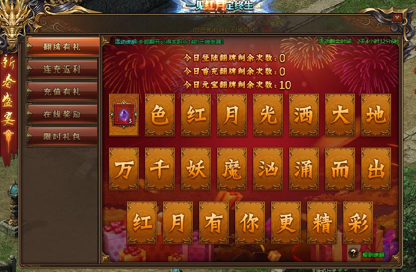 活动规则:活动期间,翻牌有惊喜,全部翻开必得本职业14阶元神武器