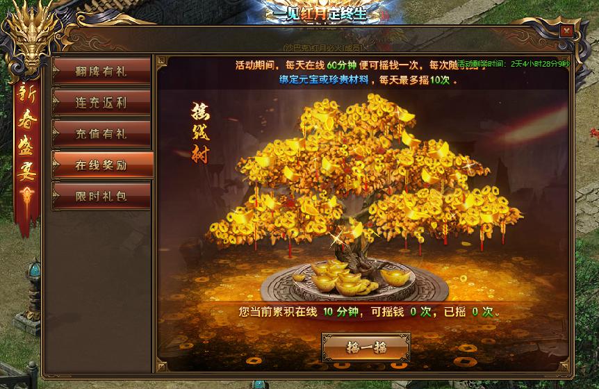 活动规则:活动期间,每天在线60分钟便可摇钱一次,每次随机掉落珍贵材料或者元宝。