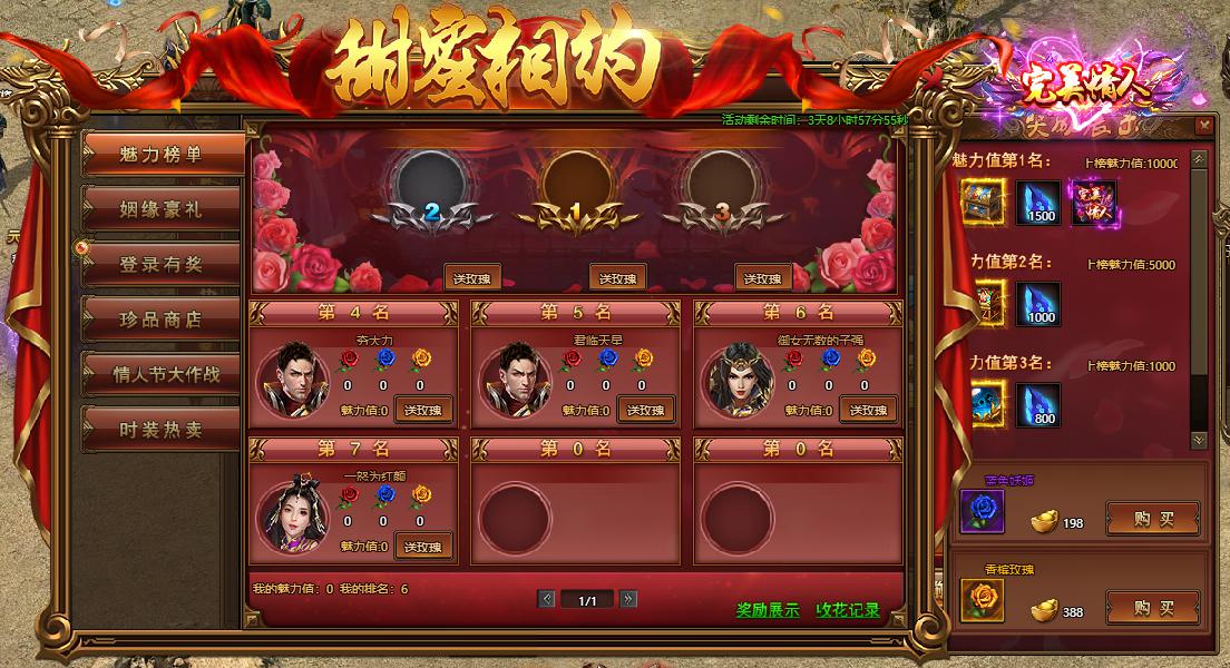 活动规则:活动期间,玩家可以赠送自己或者TA人玫瑰花增加魅力值,活动结束后按照魅力值排行邮件发放奖励。