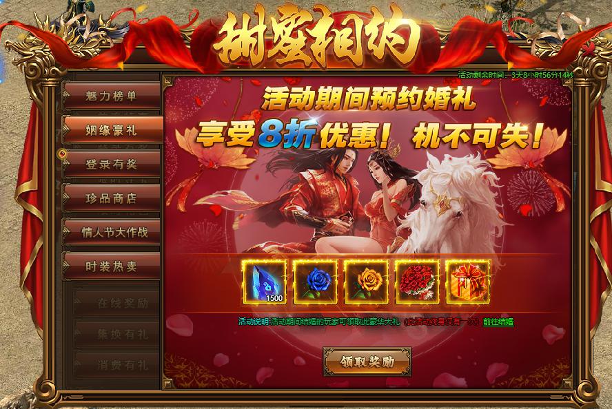 活动规则:活动期间,结婚的玩家可领取次豪华大礼。