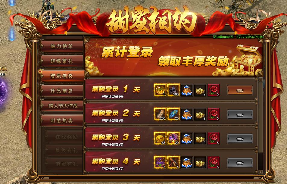 活动规则:活动期间,累计登录达到指定时间即可领取相应档次的奖励。