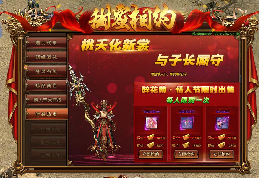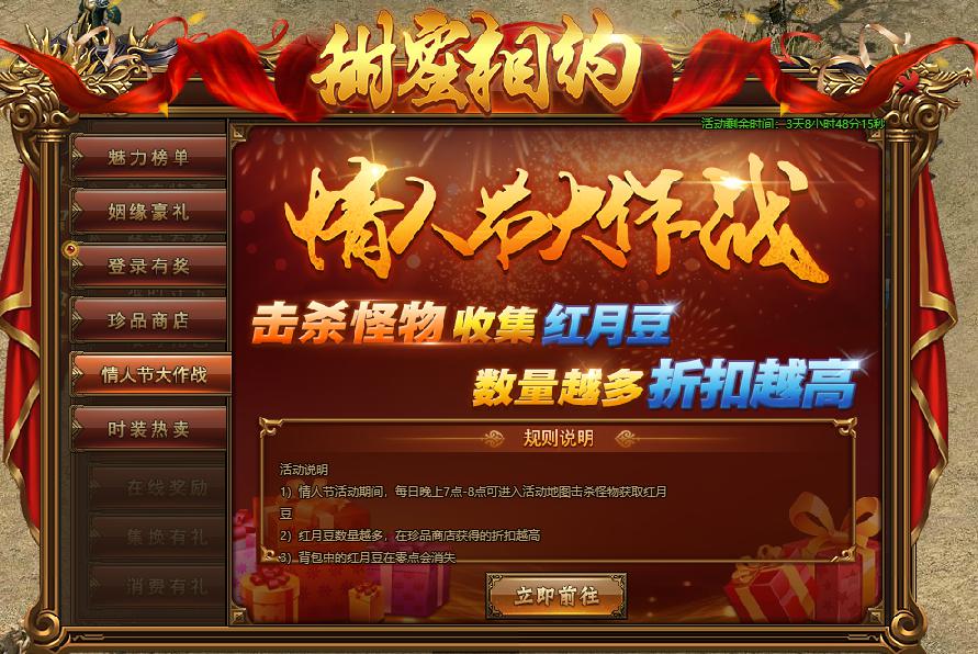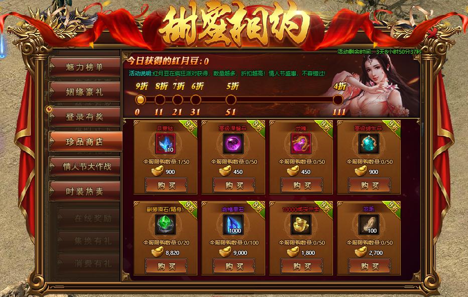 活动规则:活动期间,玩家所获得的红月豆数量越多,折扣力度越大,情人节盛惠,不容错过!