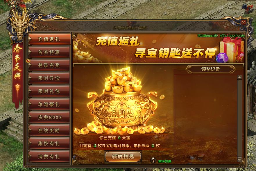 活动规则:活动期间,每累计充值2000元宝即可获得一枚寻宝钥匙,上不封顶;机会不多不要错过了哦!