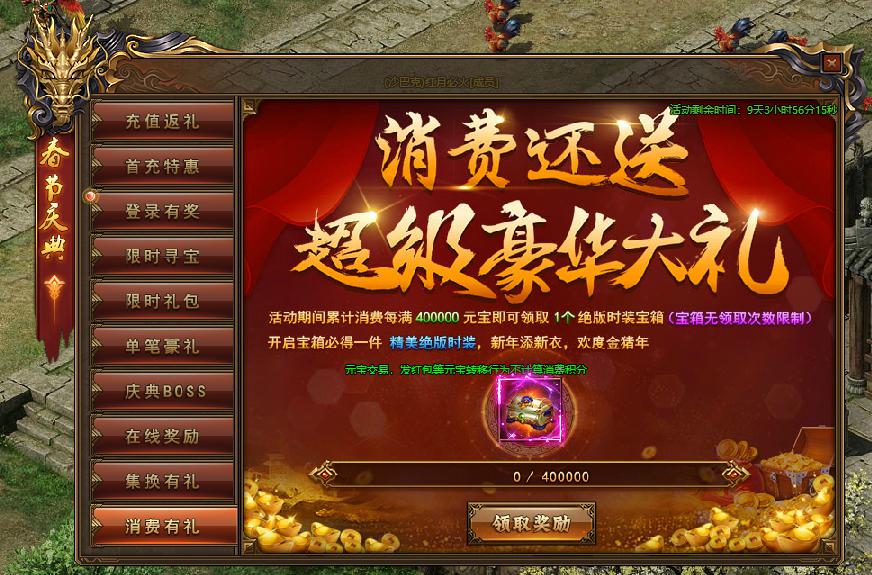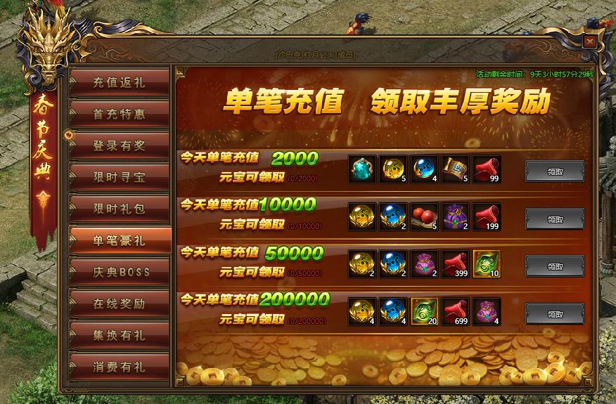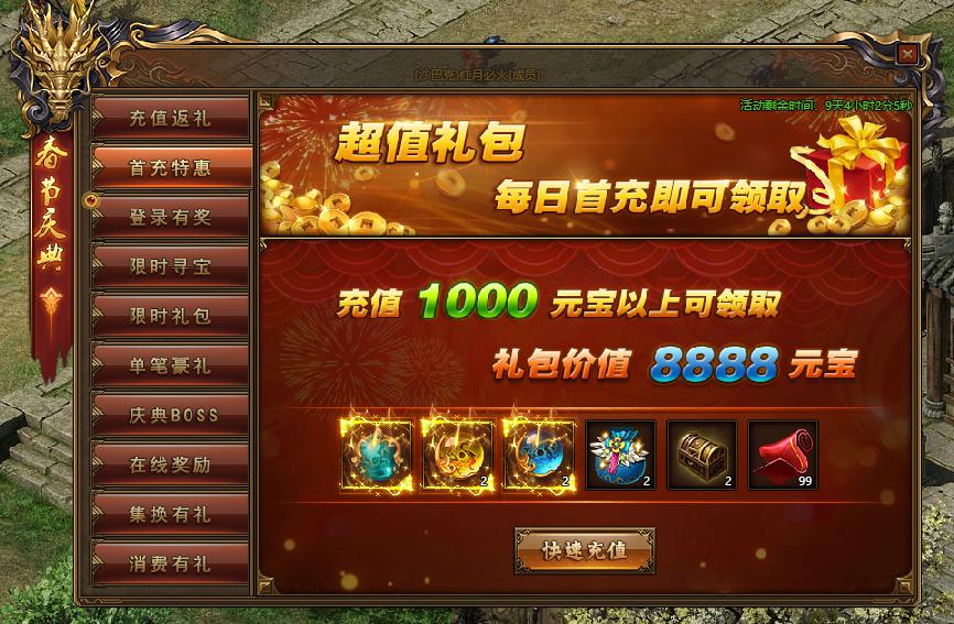 活动规则:活动期间,每充值1000元宝即可领取超值大礼包一份!
