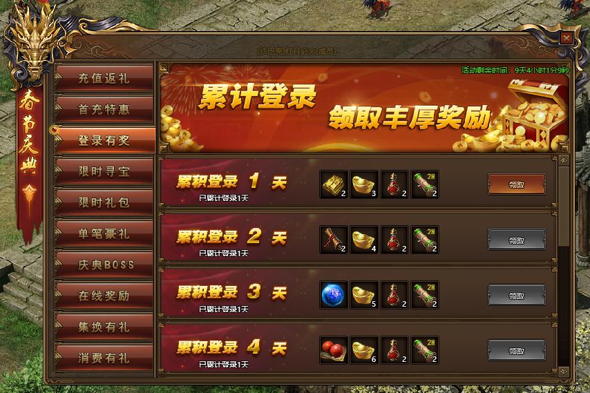 活动规则:活动期间,累计登录领取丰厚奖励,每天都有新惊喜!