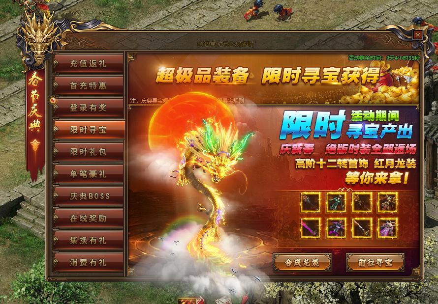 活动规则:活动规则:活动期间,限时寻宝新增产猪八戒炫酷时装、赤红翅膀、红月魔装、海神三叉戟、海王圣金甲(女)、纪元天使、纪元天使光翼、纪元能量之刃、狮舞秀金春(女),梵轮辟邪金禅、百鸟朝凤、遁甲 黯焰翼骸、九命裘衣(女)、惊魂灵狐剑、双子守护、氪石歼灭者(女)、至高超人战甲(女)、红月龙袍-无相神皇御(女)、淡蓝素雅(女),蓝羽白玫权杖。高阶十转首饰、红月龙装、红月帝武、帝释天梵首饰,有没有心动,想不想要,快点寻宝抽起来!